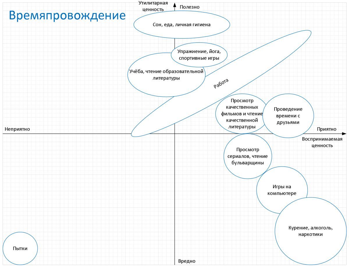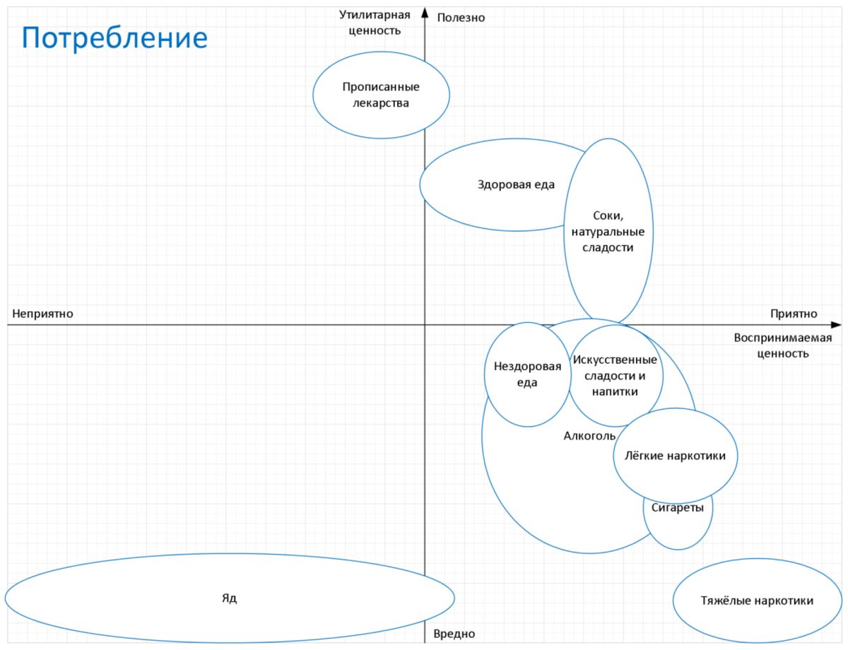 Теперь построим две диаграммы - о потреблении и о времяпровождении. По вертикальной оси отложим “Что нам полезно”, а по горизонтальной - “Что приятно”.