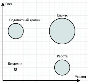 Третья ось - вознаграждение. Оно в среднем тем выше, чем выше риск и приложенные усилия. Исключения бывают, но редко, и быстро заканчиваются. Ожидаемое вознаграждение на рисунке представлено размером кружка. Я в качестве несложного рискованого занятия привел работу подопытным кроликом, но это могут быть, скажем, инвестиции в МММ-подобную структуру.